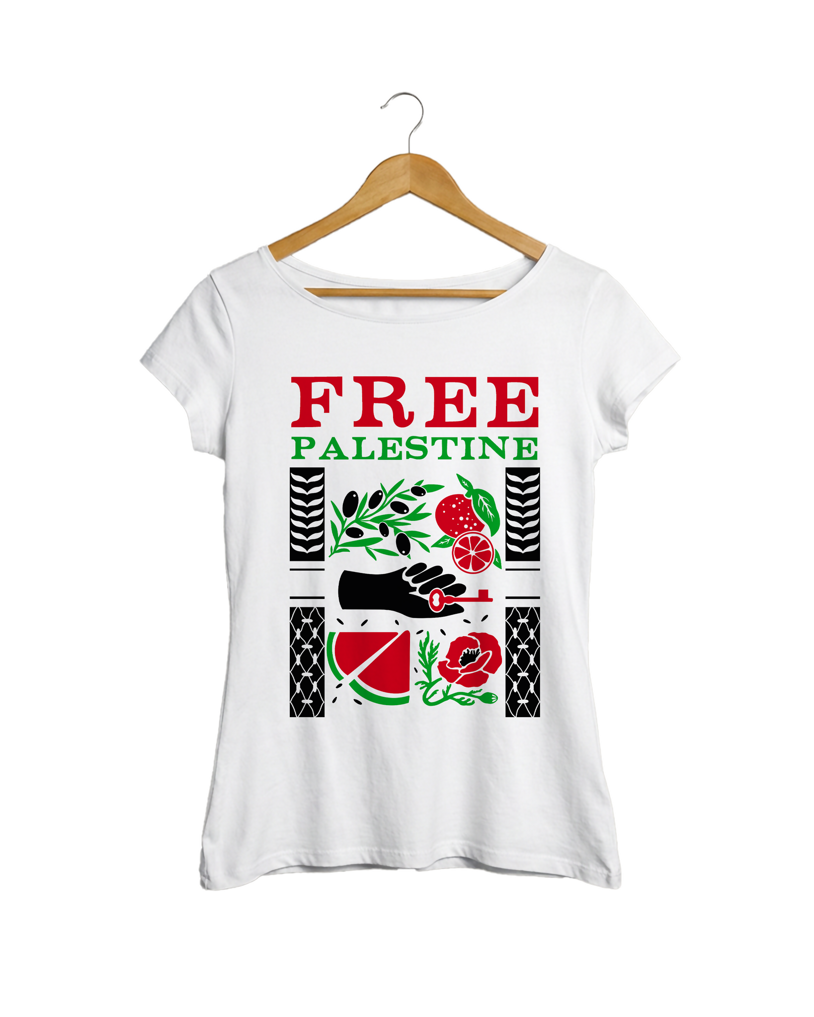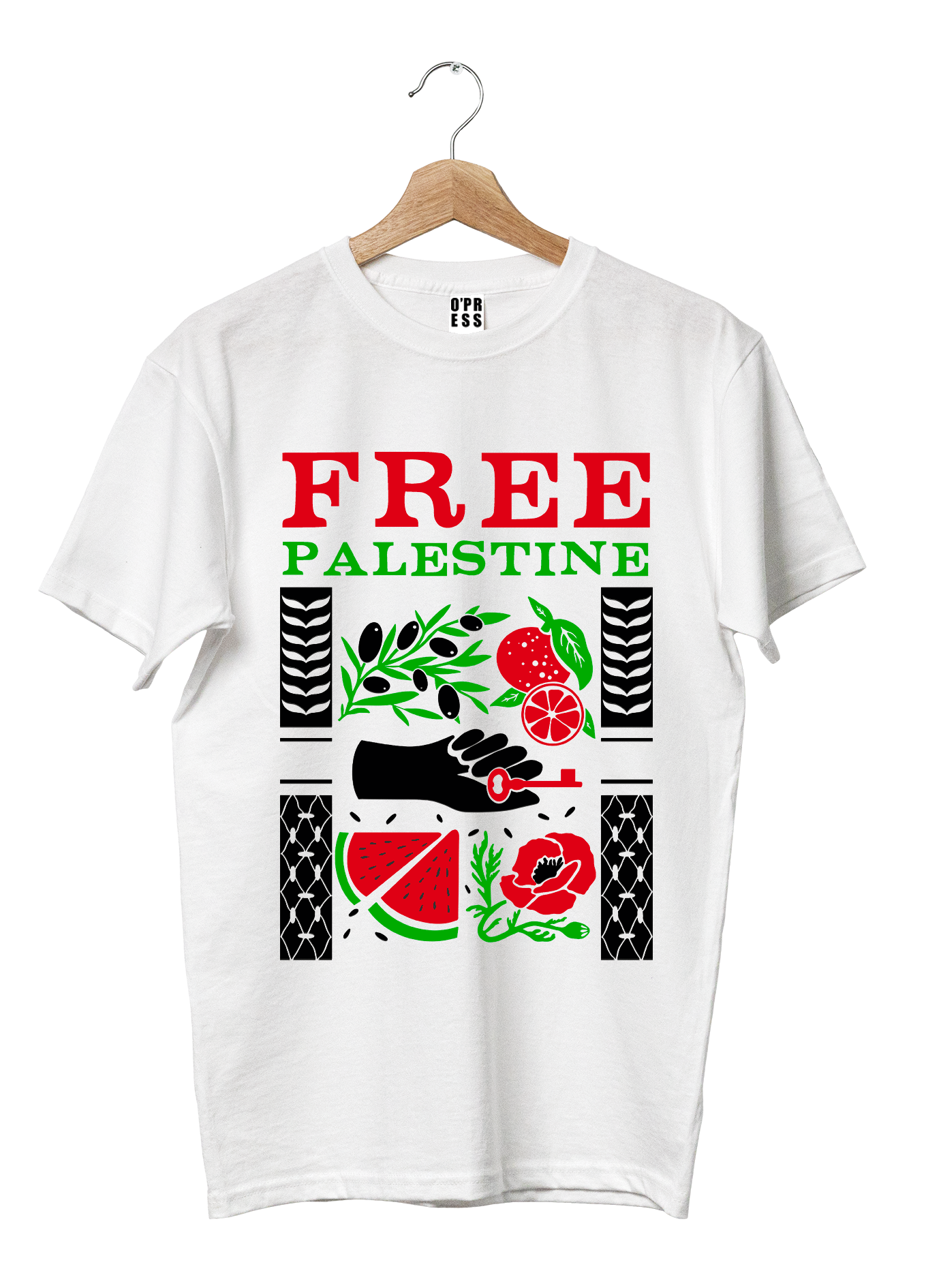 La grafica Free Palestine è ricca di elementi chiave legati alla storia e alla cultura palestinese: la keffyieh, il papavero, l’anguria, la chiave, l’arancia e l’ulivo.